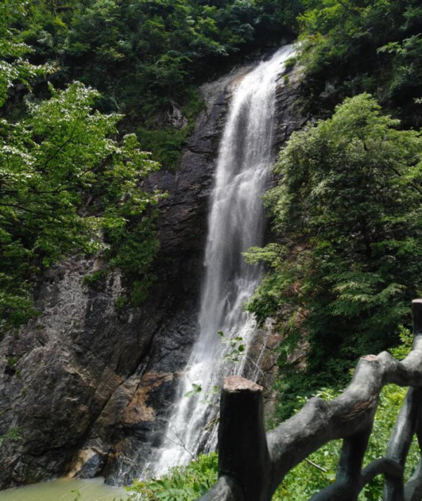 晚上睡了美美的一覺,第二天我們來到了天堂寨。那里風(fēng)景如仙境,云霧繚繞,使得人有身處仙境的感覺。遠(yuǎn)處的山峰已清淡的若隱若現(xiàn),一聲珍禽鳴叫持久而響亮地回蕩在山谷里。嘰嘰喳喳的鳥兒,悉悉索索的蟲鳴環(huán)繞耳周,攀爬在起起伏伏的山巒中,偶爾與從葉縫中鉆進(jìn)來的陽光捉捉迷藏,也為旅途增添了一番別樣的情趣。大家紛紛在瀑布前面合影留念,用相機(jī)記錄下美好的瞬間。也許真有世外桃源,這就是天堂寨。